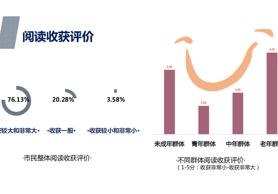 《报告》认为,不同年龄段群体的阅读自我评价呈现出“微笑曲线”, 这条“微笑曲线”引发进一步思考:在全民阅读这一国家战略背景下,应当如何提升不同年龄段群体的阅读体验和阅读收获,尤其是如何改善中青年群体的阅读状况,从而确保各年龄段群体阅读收获评价都能处在较高的水平?