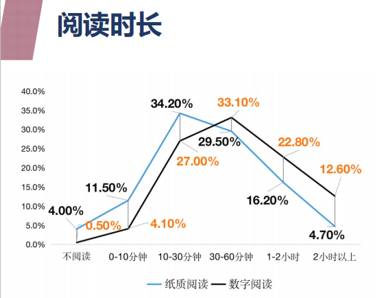 数据显示,我市市民的日均阅读时长为102.17分钟,50.40%的上海市民纸质每日阅读时长超过半小时,而有 68.50%的市民数字每日阅读时长超过半小时。总体而言,人们花在数字阅读上的时间高于传统的纸质阅读。日阅读时间越长,纸质阅读和数字阅读之间的时长差距越大。