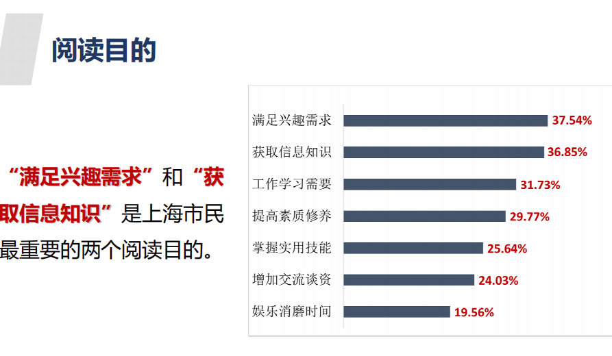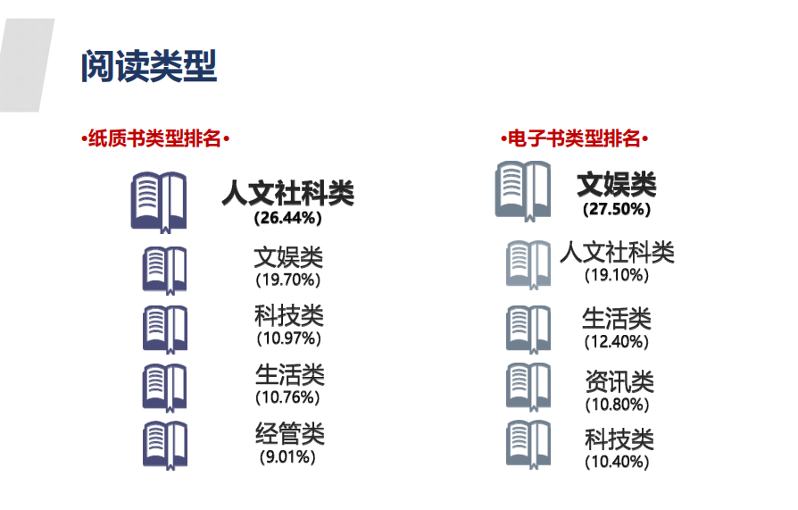 《报告》还指出,在纸质书种类的偏好上,上海市民选择阅读最多的是人文社科类书籍,占比为 26.44%,其次是文娱类和科技类; 在电子书种类的偏好上,文娱类电子书选择最多,占比为 27.50%,其次是人文社科类、 生活类和资讯类。