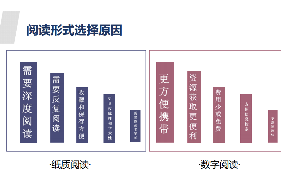 上海市民选择纸质书阅读的最重要的两个原因是“需要深度阅读”和“需要反复阅读”,而选择数字阅读的最重要的两个原因是“阅读内容更方便携带”以及“资源获取更便利”。