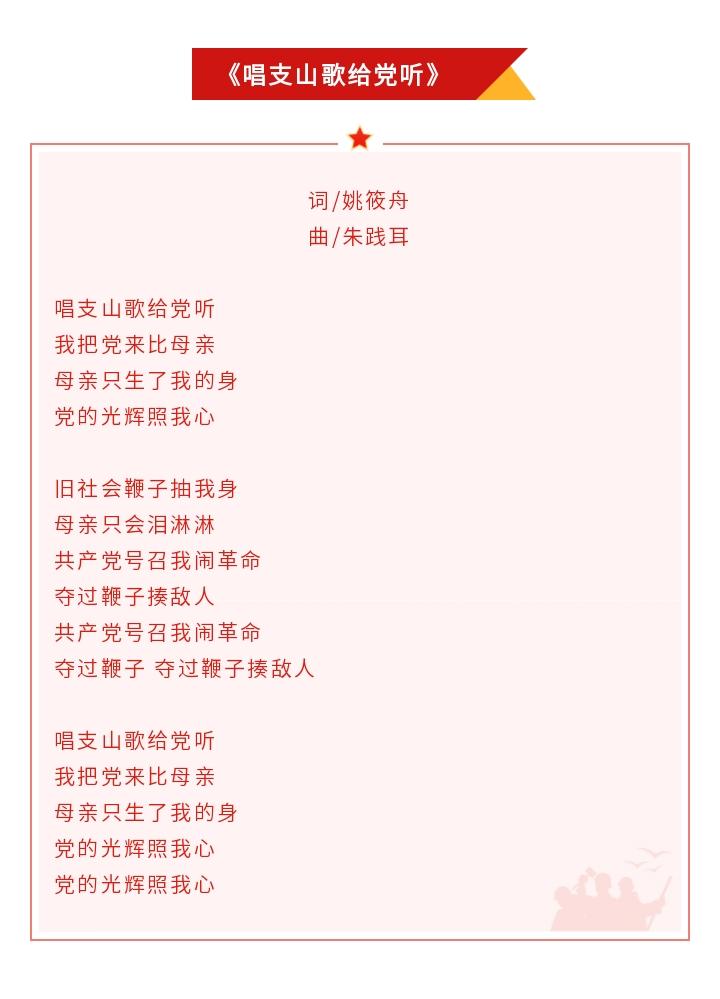在这首三部曲式结构的歌曲中,第一乐段“唱支山歌给党听,我把党来比母亲……”充满深情和激情,表达了对于党的热爱;第二乐段回忆起被旧社会鞭打,时而悲痛凄楚,如泣如诉,时而壮怀激烈,字字铿锵,表达了跟党闹革命的决心,体现出新旧社会的强烈对比;第三乐段再现第一乐段的主题,加深了旋律的印象,并把音乐推向高潮,再次强调了歌曲的中心思想。