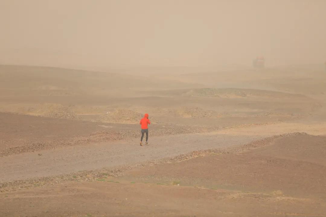 第四阶段从内蒙古呼和浩特到新疆叶城,全程6039公里,2000多公里的戈壁滩和长时间的沙尘暴让他吃尽苦头,“一半的时间都在刮沙尘暴,一吹就是一整天,只能是车打着双闪,在前面慢慢开,我跟在后面慢跑,每天结束后,头发和衣服上全是沙子。”