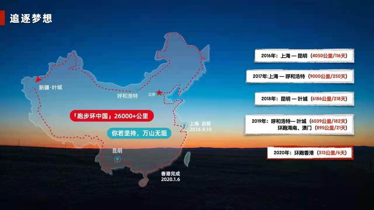 2019年,呼和浩特出发跑到叶城,6039公里,182天完成;随后,他又开始环跑海南和澳门,总计895公里,21天完成。