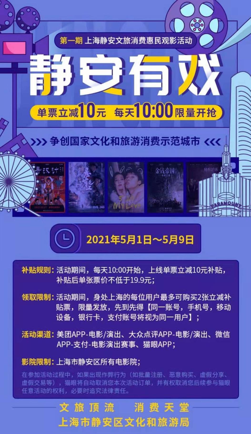 记者了解到,今年5月1日至9日期间,猫眼将携手静安区上线主题为“静安有戏”的文旅消费惠民观影活动。活动期间,凡是在上海的用户,通过猫眼电影购买静安区影院电影票,均可享受单票立减10元的超值优惠。