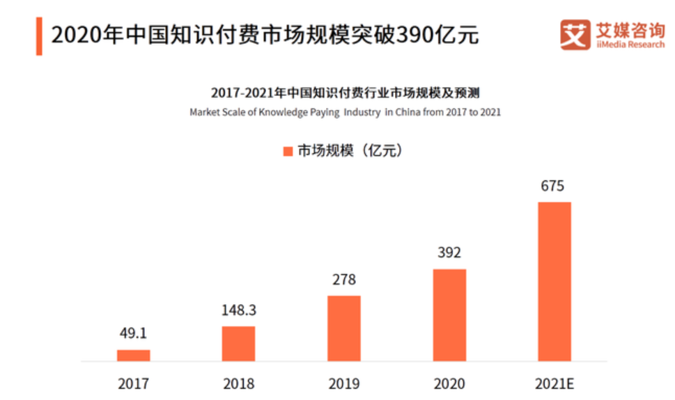 据艾媒咨询,2020年我国知识付费市场规模达到390亿元;2021年,市场规模有望达到675亿元。与市场规模相对应的是用户规模:据易观数据,2020年,泛知识付费用户规模突破5.4亿。愿意为知识付费的人口超过国民人口的1/3。这也意味着,大众消费观念的转变。