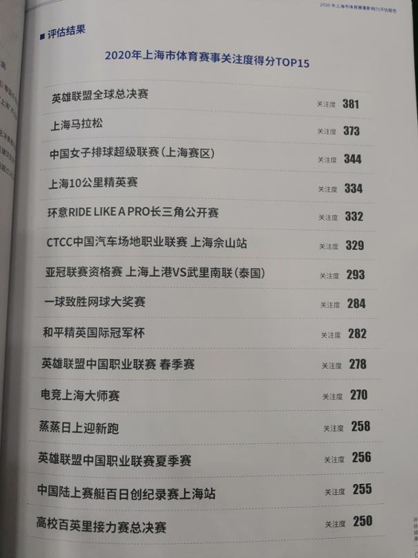 5月11日,《2020年上海市体育赛事影响力评估报告》发布,在满分为1000分的评估体系中,“上海马拉松”和“S10英雄联盟全球总决赛”得分均超过900分,成为2020年上海最具影响力的头部赛事。