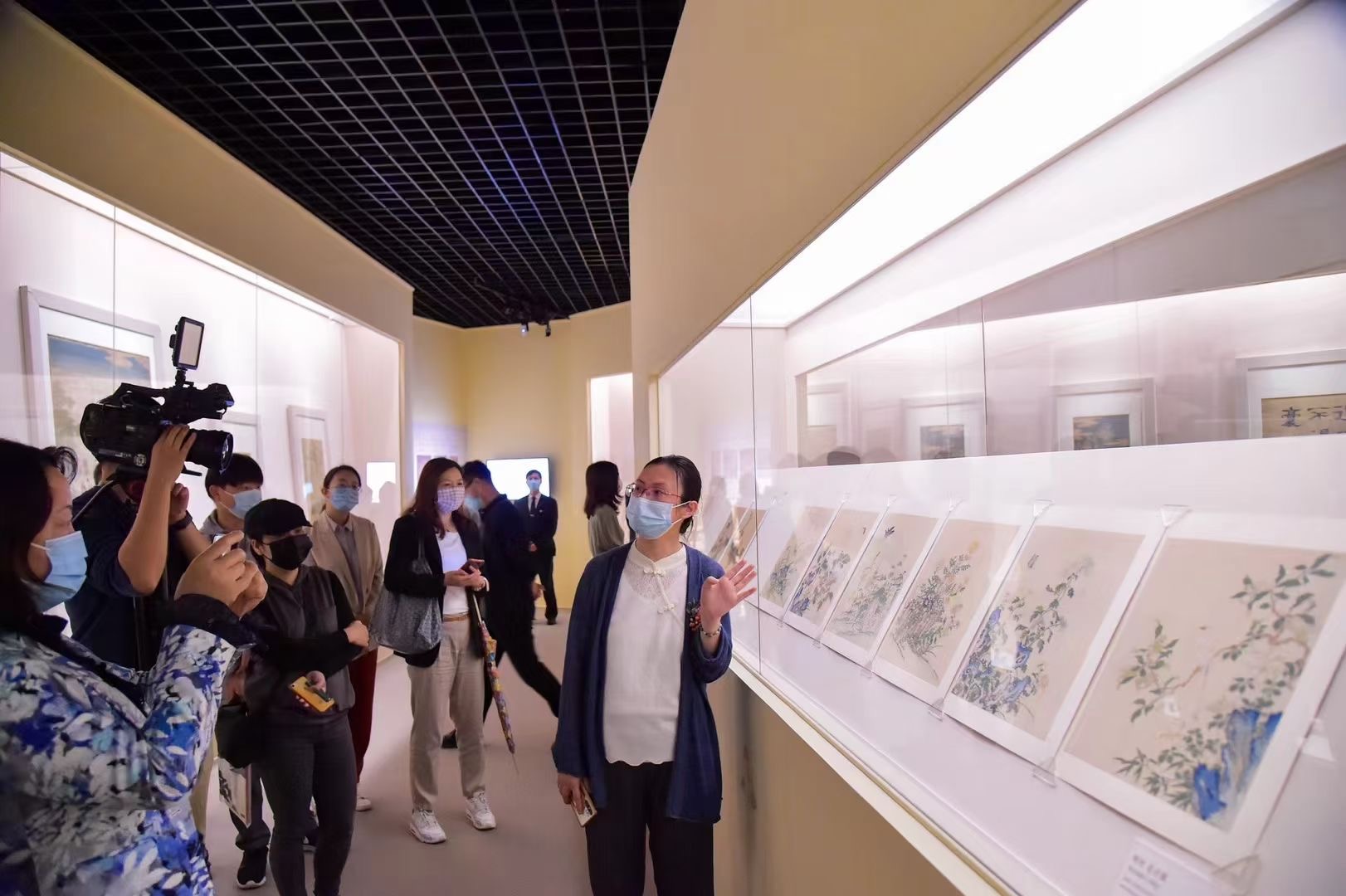 在辅助展品的展陈方面,本次展览不仅展示了明清针法图灯箱,还将缂丝书画、顾绣历史和技艺发展过程等学术研究成果通过浅显易懂的展版图谱展示给观众。作为上海博物馆藏国宝级文物的南宋朱克柔缂丝《莲塘乳鸭图》,虽其真迹因条件限制,不能现身展厅,但通过展厅中高清放大近两倍的照片,观众也能清晰看到这件作品的绝代风华。此外,观众还可以扫码获取“朱缂法”的导览说明及3D视频,一窥其神乎其神的缂丝技艺。