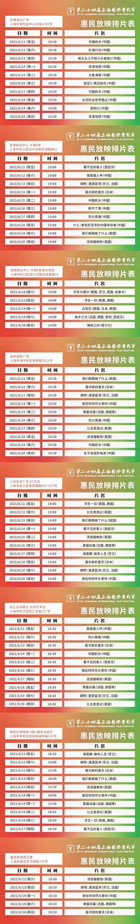 据了解,本届上海国际电影节惠民放映活动将于6月11日正式开启,在环球港、滨港商业中心今潮8弄、金桥国际商业广场、上滨生活广场、松江云间粮仓文创园、奉贤区博物馆、嘉定西云楼设置了7个放映点。电影节期间,将陆续放映21部、70场海内外优秀电影作品,这也是上海国际电影节惠民放映首次走进奉贤新城和嘉定新城。