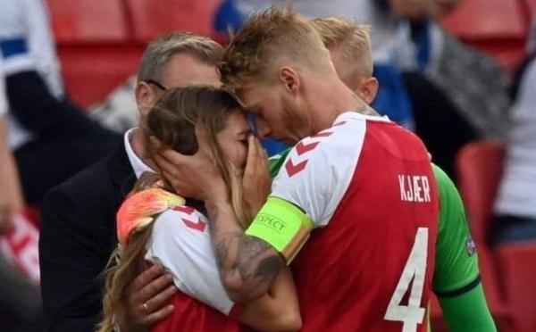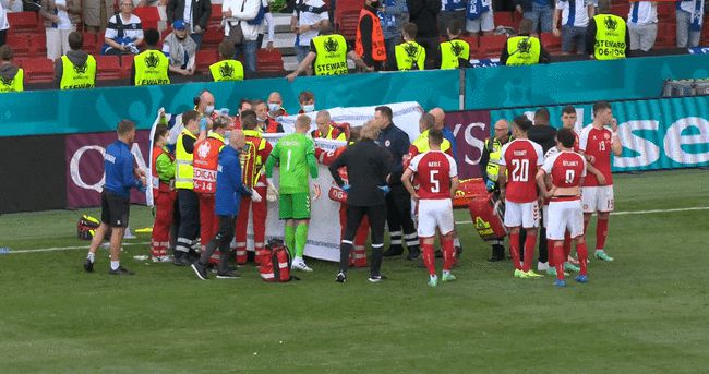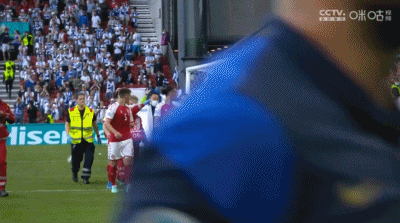 当时,现场的转播镜头拍到了不少球迷已经崩溃落泪,而场上的丹麦球员也难以控制自己的情绪,不少人用球迷捂住自己的脸,但是他们尽力保持着冷静,并且为埃里克森祈祷。