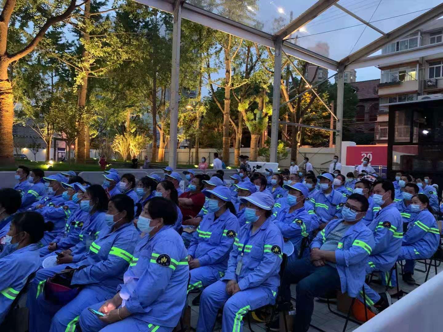 而为了让环卫工人在忙碌的工作之余也能够放松心情,虹口区早早就开始策划此次专场放映。据今潮8弄负责市场推广的吴九颖介绍,今年今潮8弄15天的惠民放映是联合了虹口区政府、团委、妇联、街道、工会共同招募的,旨在让更多人欣赏到优秀的电影电视。而16日晚的环卫工人专场,则是由虹口区工会发起,当天,他们组织了虹口三家不同的环卫公司的工人前往观影。