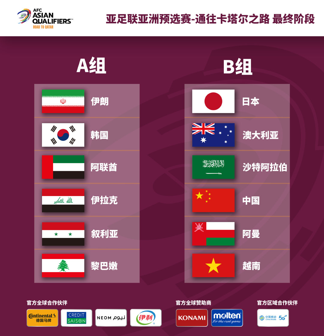A组:黎巴嫩、叙利亚、伊拉克、阿联酋、韩国、伊朗