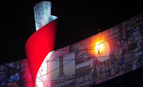 2008年北京奥运会,中国体操运动员李宁手持火炬,如空中飞人般,踏过在体育场上方徐徐展开的一幅长卷,最终点燃了鸟巢体育馆的主火炬。
