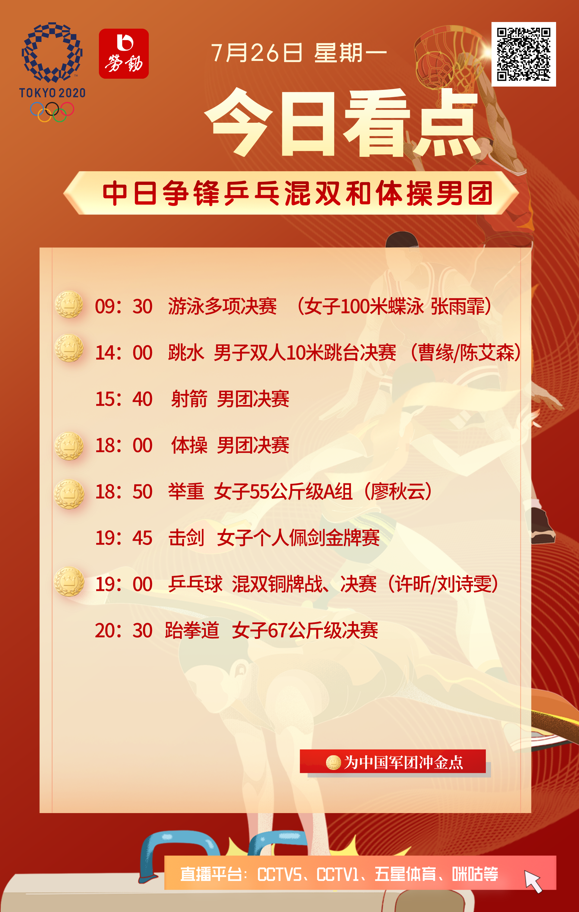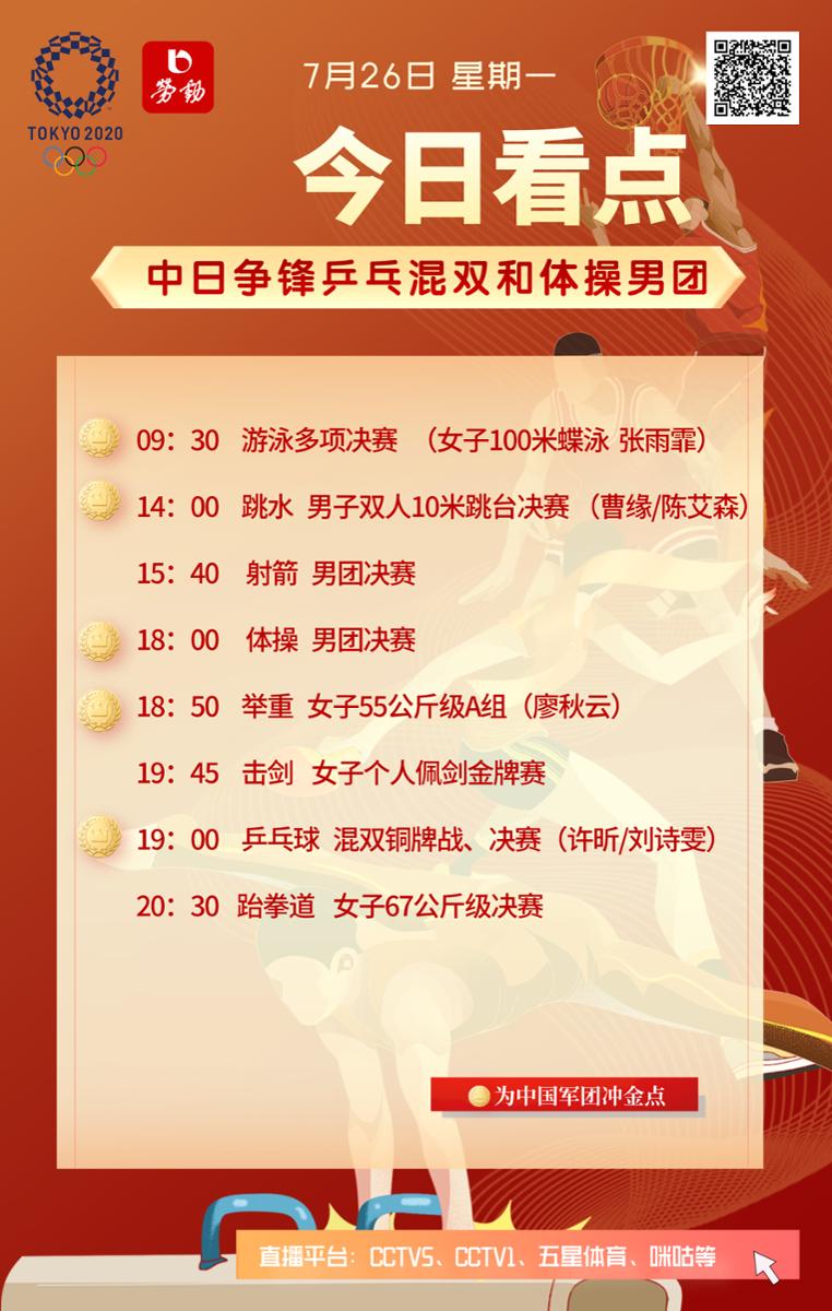 7月26日,东京奥运会将在14个项目产生总计21枚金牌,上午的游泳赛场,中国新“蝶后”张雨霏有夺取女子100米蝶泳的金牌实力。中国乒乓球的“新闻联播”组合许昕/刘诗雯将在混双决赛迎战东道主日本队的水谷隼/伊藤美诚。竞体体操赛场,上届奥运会遭遇滑铁卢的中国队明显复苏,将在男团决赛赛场与实力出众的日本男团硬碰硬。