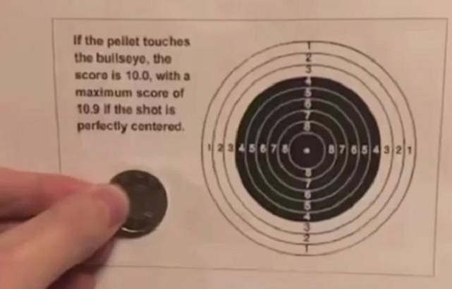 据了解,10米气步枪用的靶子,直径4.55厘米左右、9环直径5.5毫米;正中间靶心的直径只有0.5毫米,这就和我们的头发直径差不多。也就是说,从10米远的地方看去,标靶视觉大小只相当于一枚一元硬币。而奥运会气步枪比赛,选手使用的“瞄准镜”又是没有放大功能的,只是单纯地起到辅助瞄准的作用。也就是说,气步枪选手几乎是看不见靶心的。