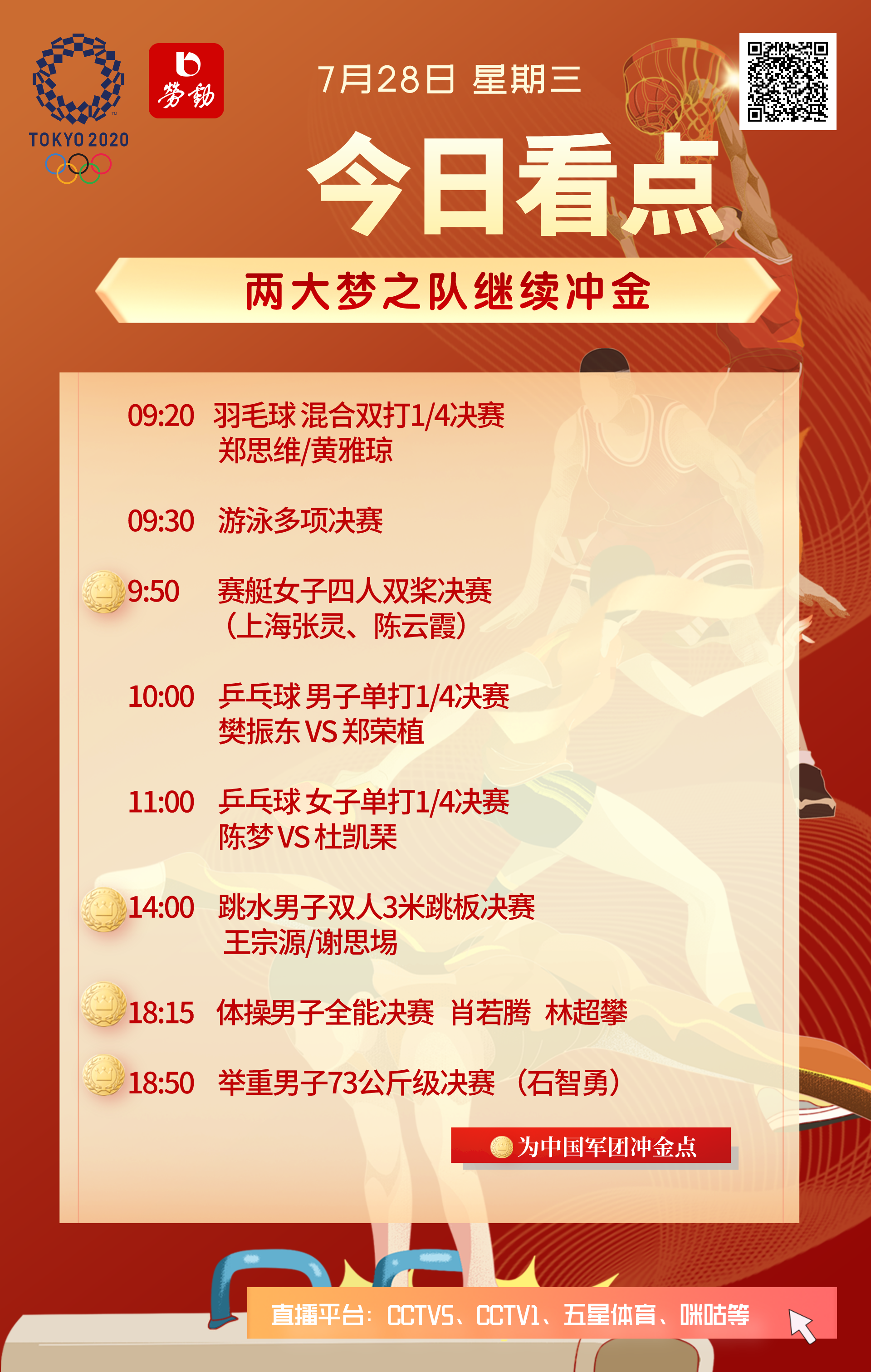 7月28日上午,赛艇28日将决出6金,是当日金牌数最多的项目。中国队在女子四人双桨、男子双人双桨和女子四人单桨三个项目有冲金实力。在赛艇女子四人双桨的争夺中,上海选手张灵、陈云霞将与搭档崔晓桐、吕扬一起出战。之前的预赛,以6分14秒32的成绩,强势获得小组第一,成功晋级A组决赛(金牌赛),领先第二名德国队近4秒,夺金把握很大。