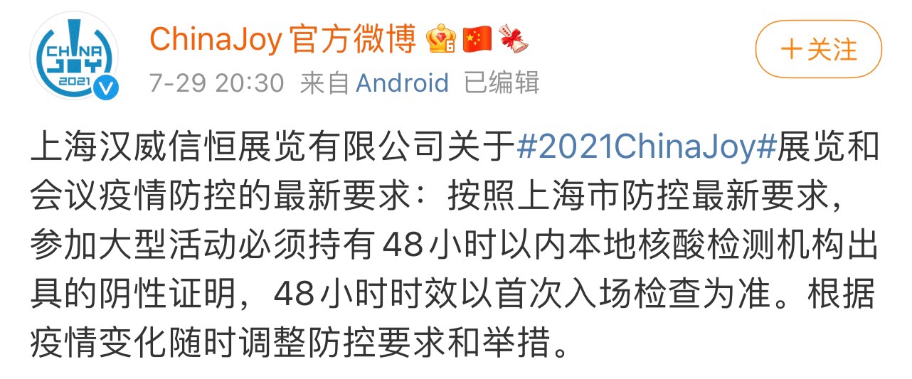 7月29日晚间,2021ChinaJoy防控再出新规:入场观众需要持有48小时以内本地核酸检测机构出具的阴性证明。