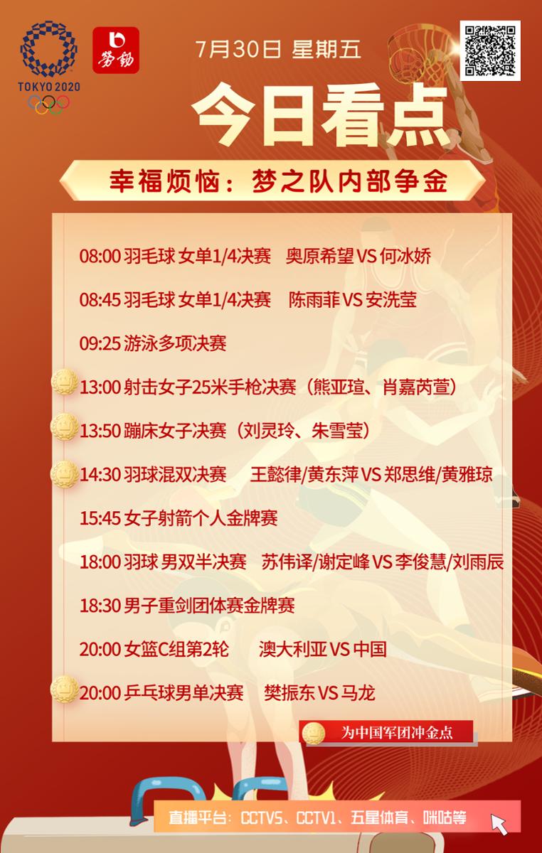 此外,田径将展开首个比赛日争夺,产生男子10000米金牌,男子跳高、女子100米、女子铅球资格赛都将资格赛争夺。