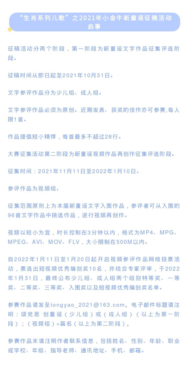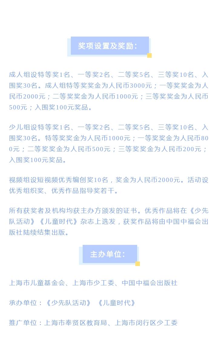 本次活动由上海市儿童基金会、上海市少工委、中国中福会出版社共同主办,《少先队活动》《儿童时代》承办。自1986年第一届举办以来,坚守了35年的“生肖系列儿歌大赛”不忘初心,凝聚了一批批热爱童谣的创作者,为少年儿童遴选出了积极向上、充满童趣的童谣佳作,赢得了社会各界的好评。值此建党百年之际,本届征稿活动以“颂党恩 创童谣”为主题,以少儿喜闻乐见的方式赓续红色血脉,传承红色基因。