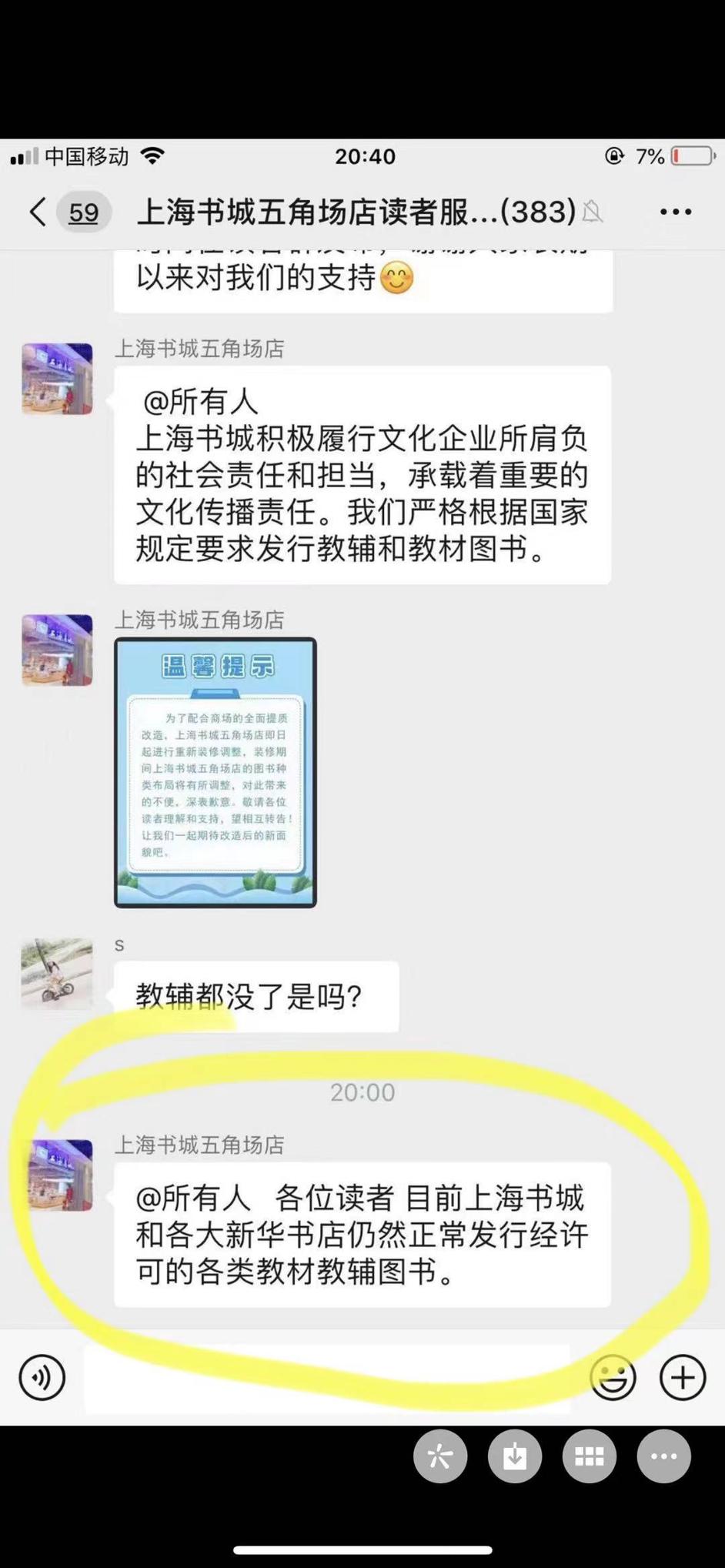 而同日当晚21:10,微信聊天记录所述“上海书城鞍山店一眼望去黑灯瞎火”也并非属实,真实情况是上海书城鞍山店的营业时间为9:00-20:00,根据微信聊天记录时间显示此时所表述时间,已过上海书城鞍山店的营业时间。