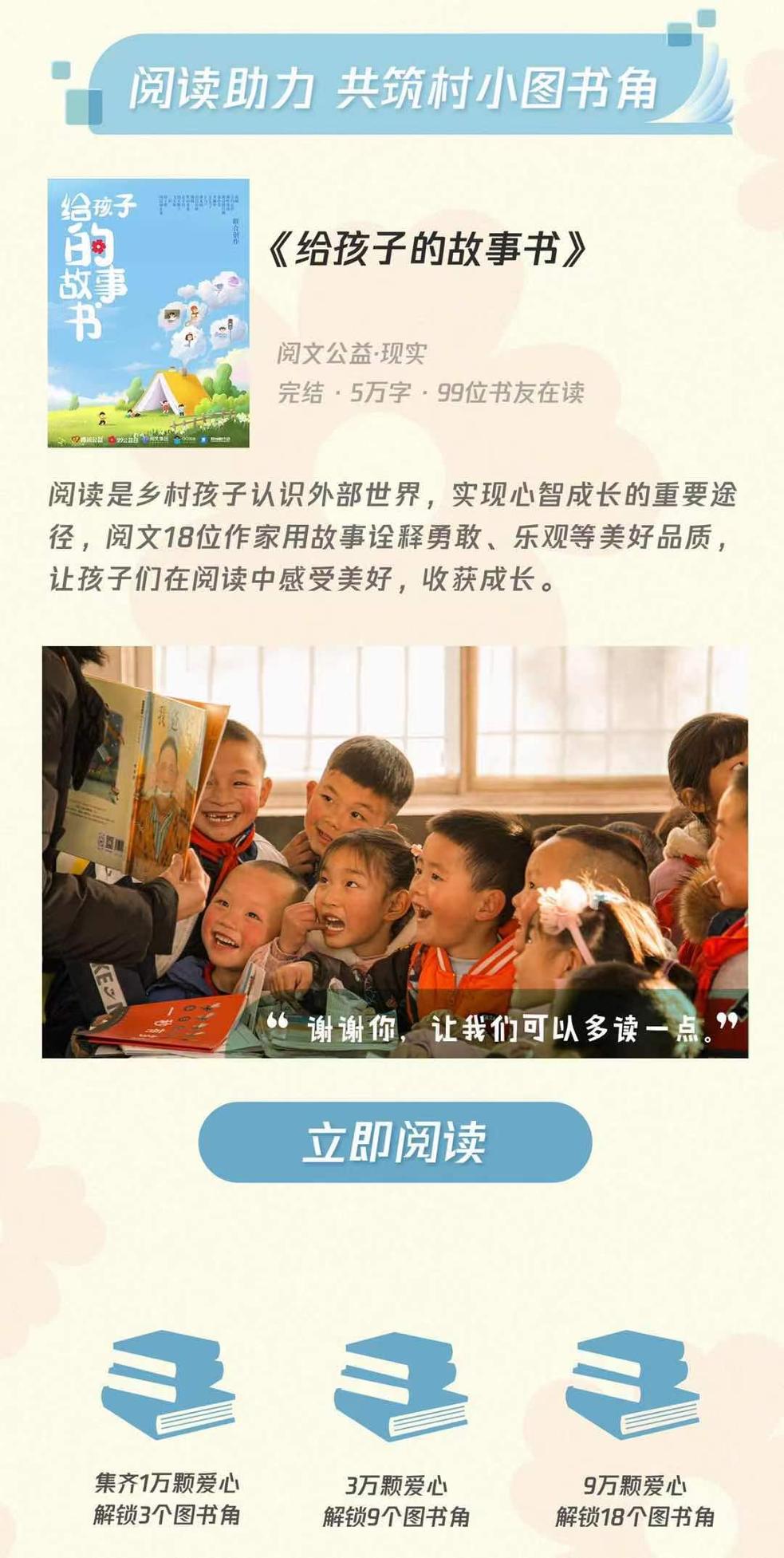 活动期间,读者前往QQ阅读APP、小程序均可阅读作家们创作的故事,在QQ阅读APP搜索“给孩子的故事书”还可参与“益起读好书”公益行动,通过完成收藏、阅读、分享等阅读任务获得“爱心”。阅文集团将根据“爱心”数量捐建对应数量的乡村小学班级图书角。