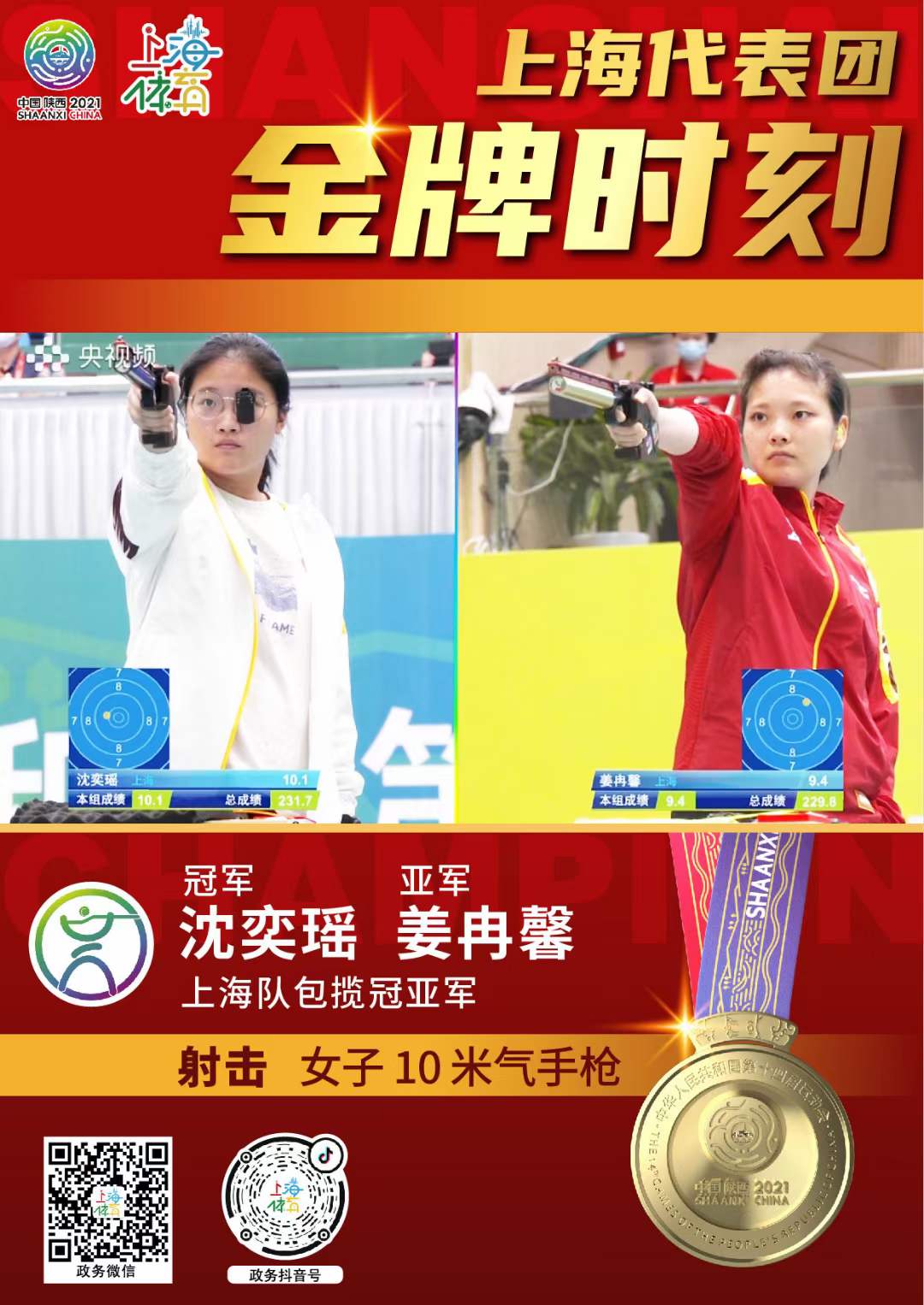 9月14日,第十四届全运会结束一场竞争激烈的女子10米气手枪决赛,上海队包揽冠亚军,小将沈奕瑶后程发力,逆转奥运冠军姜冉馨夺得金牌。从2000年悉尼奥运会的陶璐娜,到东京奥运会的姜冉馨,再到本届全运会包揽冠亚军,也显示出上海在女子10米气手枪的优势。