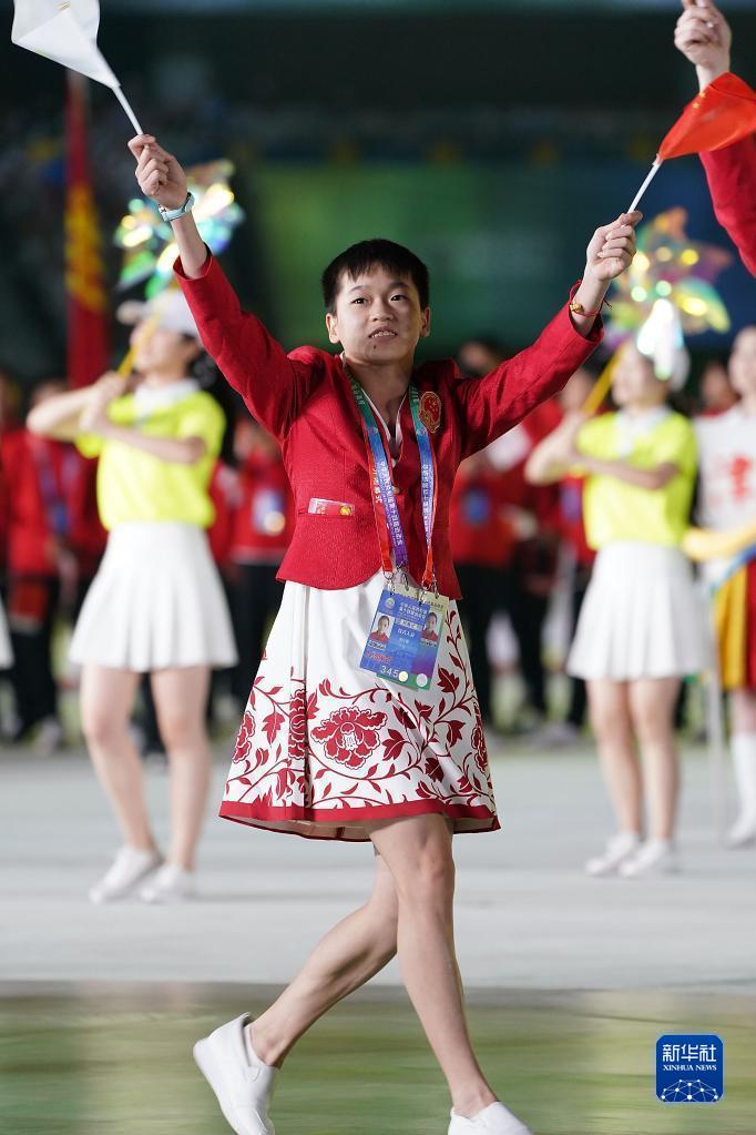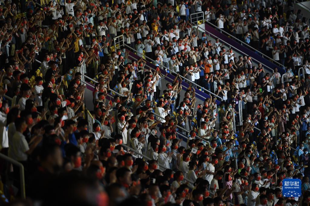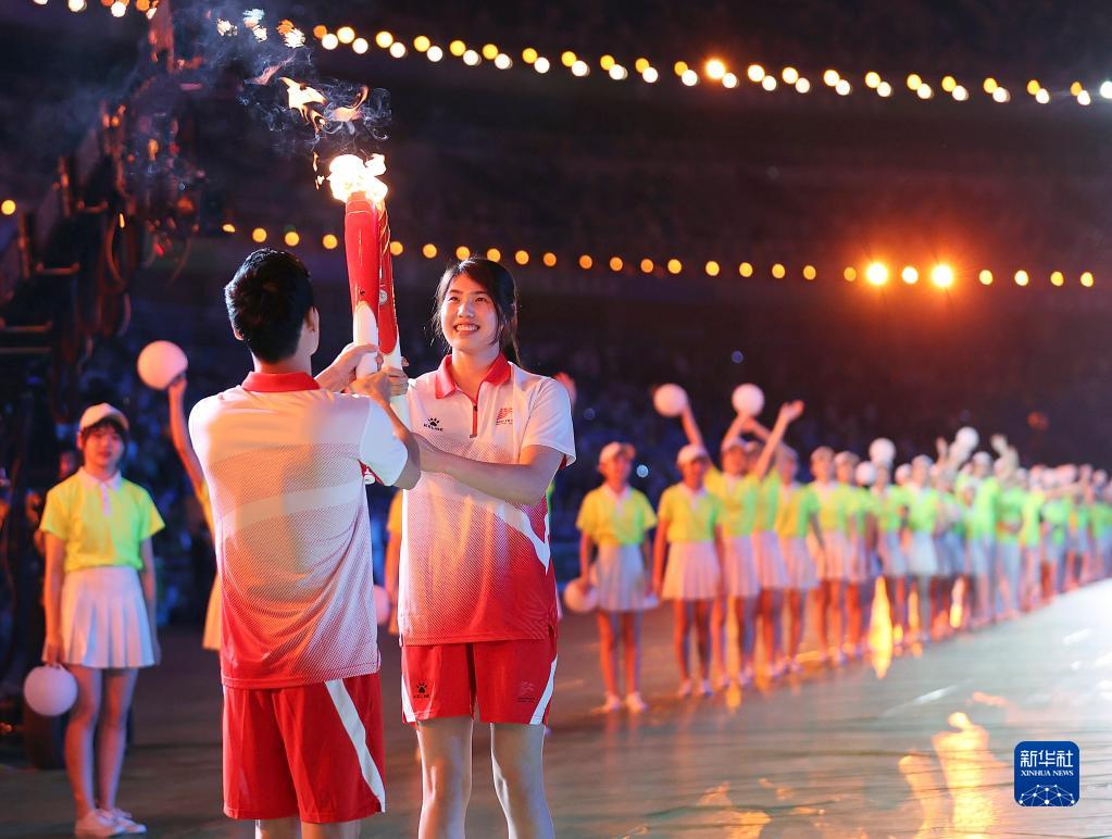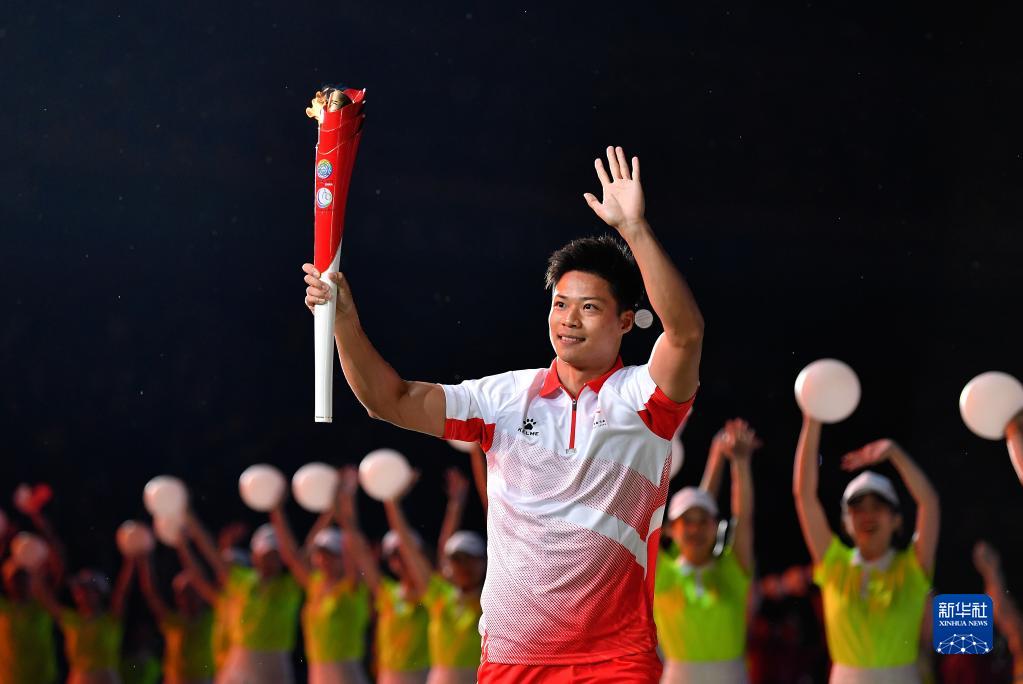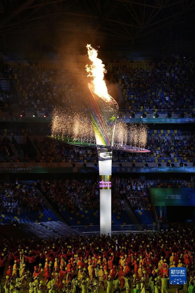 在全场数万名观众的欢呼声中,杨倩点燃全运会主火炬。据悉,本届全运会点火装置取型于会徽中象征运动项目的外环,与主火炬塔“复兴之火”形成同心圆。