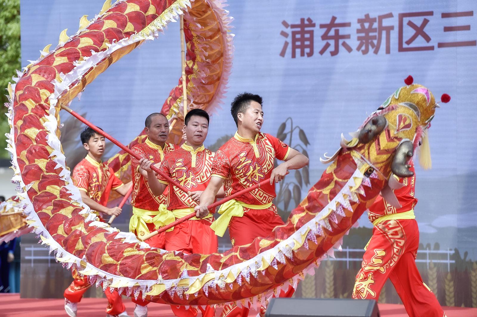展演团队成员并不只有“老农”,还不乏有志于推广农民体育传统项目的90后。上海体育学院研究生张新月,毕业后进入了三林舞龙队,并成为上海龙狮协会的工作人员。他介绍,松江叶榭的“舞草龙” ,金山吕巷的“小白龙信俗”,三林镇的“浦东绕龙灯”等,都是国家级非遗项目。