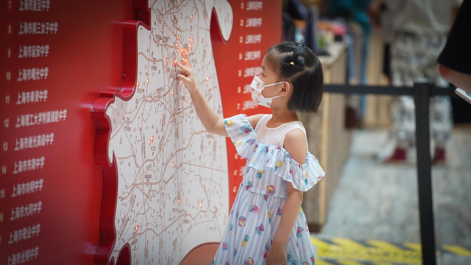 展览尾声部分还设计了一个“考点里的红色经典地图”装置,该装置将上海市地图的整体轮廓,以立体形式表现,并用红点标注了48所承担过本市各级各类考试的中学。地图以红色为主色调,也象征着红色文化一直是上海的城市底色,是鲜明的城市标识。