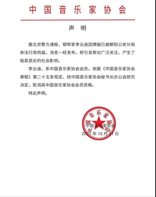 李云迪,系中国音乐家协会会员。依据 《中国音乐家协会章程》第二十五条规定,经中国音乐家协会秘书长办公会研究決決定,取消其中国音乐家协会会员资格。