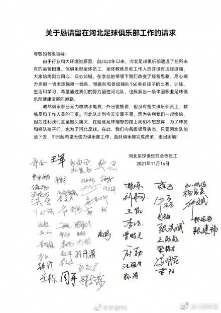 信中写道:“俱乐部已无力缴纳水电费、外出差旅费,但没有拖欠俱乐部员工、教练员和工作人员的工资。在此,我们向各级领导表态,只要河北队能活下去,即日起希望无偿为俱乐部工作,直到俱乐部完成改革,走出困境。”