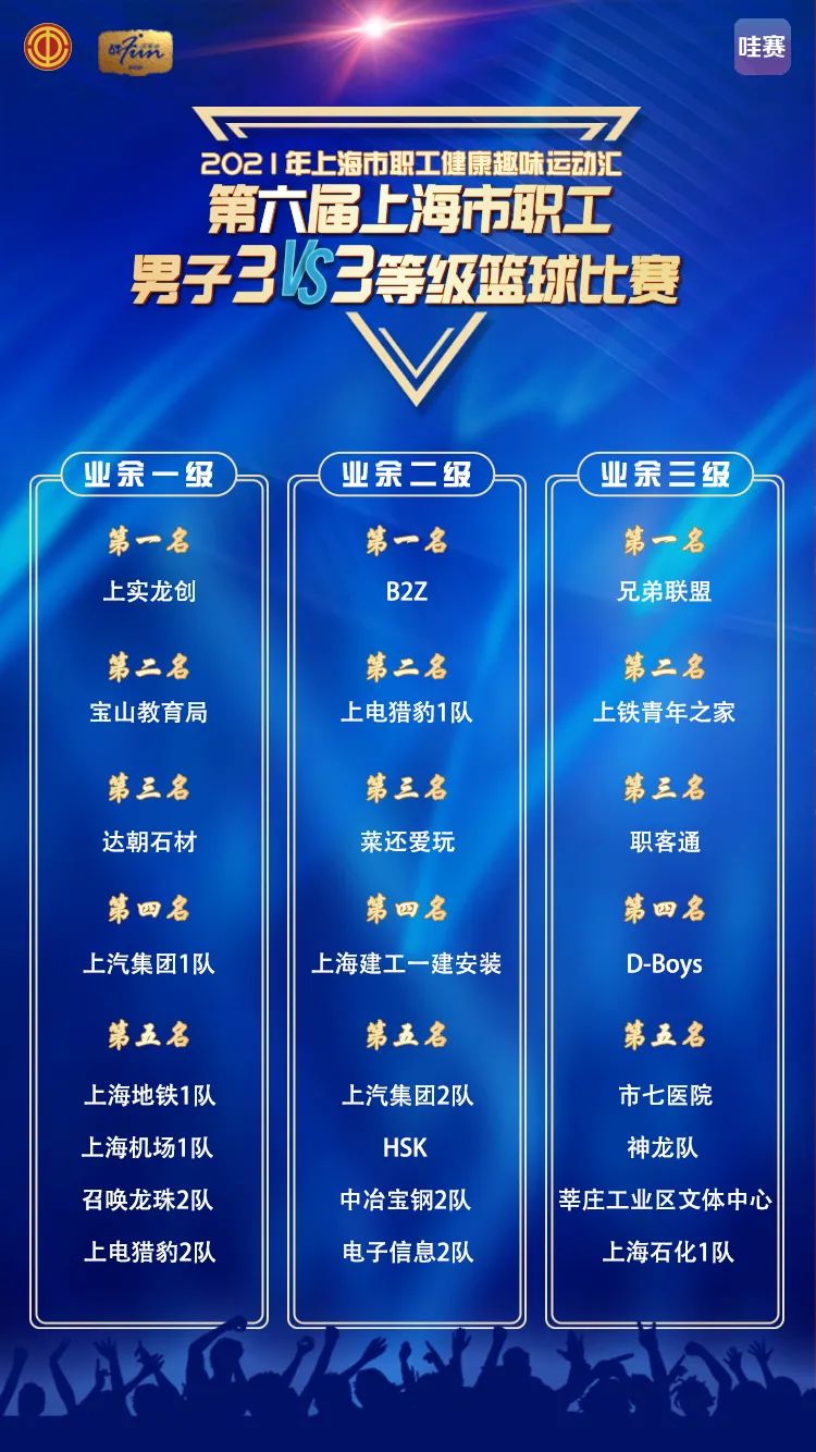 据了解,上海市职工男子“3VS3”等级篮球联赛也将一直延续下去,并且作为上海市职工篮球特色IP赛事,结合打造“宝山篮球之城”的步伐,将进一步服务于篮球的职工朋友。