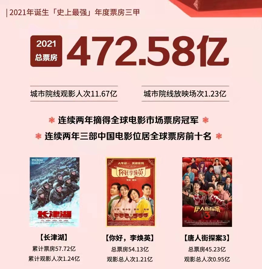 2021年,中国电影市场以472.58亿卫冕全球票房冠军,年度票房前三甲花落《长津湖》《你好,李焕英》和《唐人街探案3》,三者总票房突破了150亿元大关,这也是中国电影连续第二年有三部作品跻身全球票房前十名。