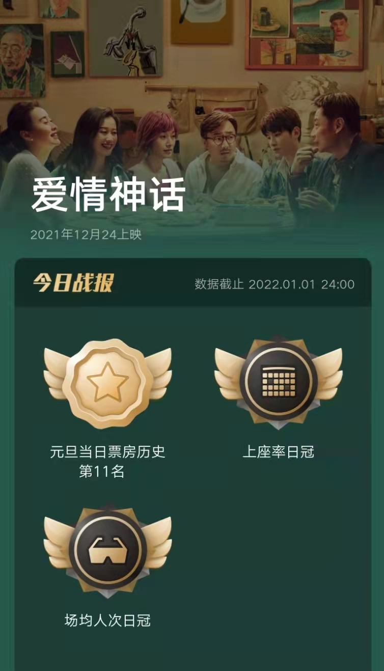 值得一提的是,元旦假期三天,《爱情神话》一直稳居上海单日票房冠军宝座。按54.1元的平均票价测算,这三天至少有52万名上海观众进入影院观看了这部电影。许多业内人士表示,《爱情神话》完全超出了此前保守的心理预期,在上海市场创造了属于自己的票房神话。