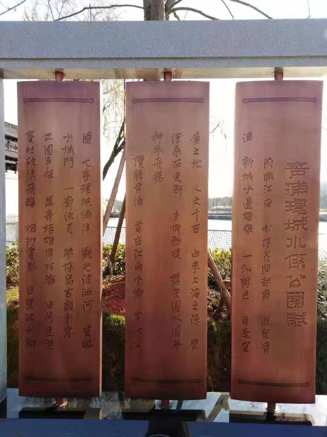“我对青浦有感情,热爱这片土地。有了征文之后,我就开始思考。一天,下了班回到家,8点多有了一些灵感,我就赶快开始写,11点多就完了。”张涛涛说,后来他又反复吟诵斟酌,稍微修改了几个字,“文章是我写的,书法是上海市书协顾问刘一闻老师完成,后来刻在了街头,我倍感荣幸。”