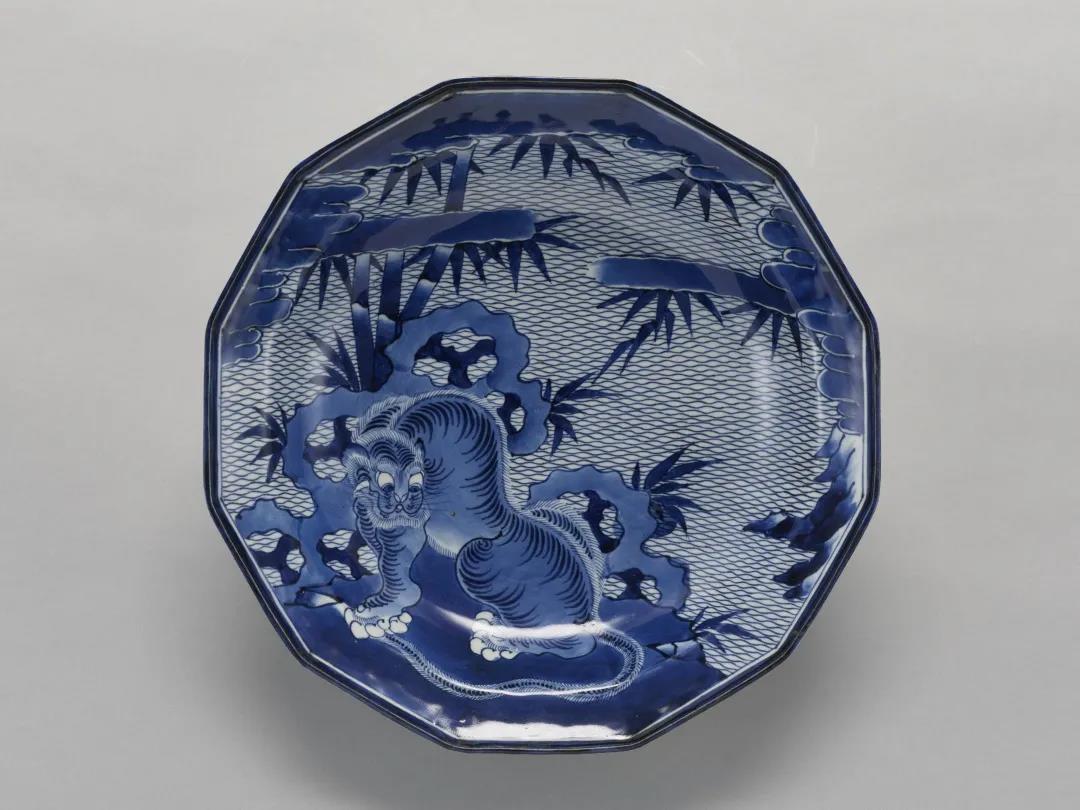 青花虎竹图十二角形盘烧制于日本有田窑(今佐贺县有田町),内壁绘有虎、竹、太湖石、祥云等纹样,外壁画牡丹和山茶花纹样,圈足内外各绘弦纹一道。16世纪末,武士家族在宴会时盛行使用大盘摆放菜肴,起初他们用景德镇等地生产的中国瓷盘。直到17世纪初,有田窑兴起后,本土制作生产的大盘渐渐成为日本上流社会餐桌上的奢侈品,此类虎竹图大盘受到了广泛青睐而传世最多。