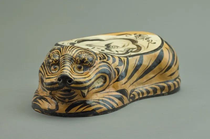 其中,金代黄地黑彩雁衔芦苇纹虎枕为卧虎形,背部为枕面,前低后高。虎身先施白色化妆土,再罩黄彩,黄彩之上以黑彩描绘虎斑,枕面未施黄彩,白地之上以黑彩绘雁衔芦苇纹,笔法生动活泼。虎枕有着吉祥、辟邪的寓意,陶瓷虎枕是金代盛行的一种很有特色的生活用具,大致有白地和黄地两种,主要产地在山西、河南一带。从考古出土来看,它的使用范围集中于黄河流域。
