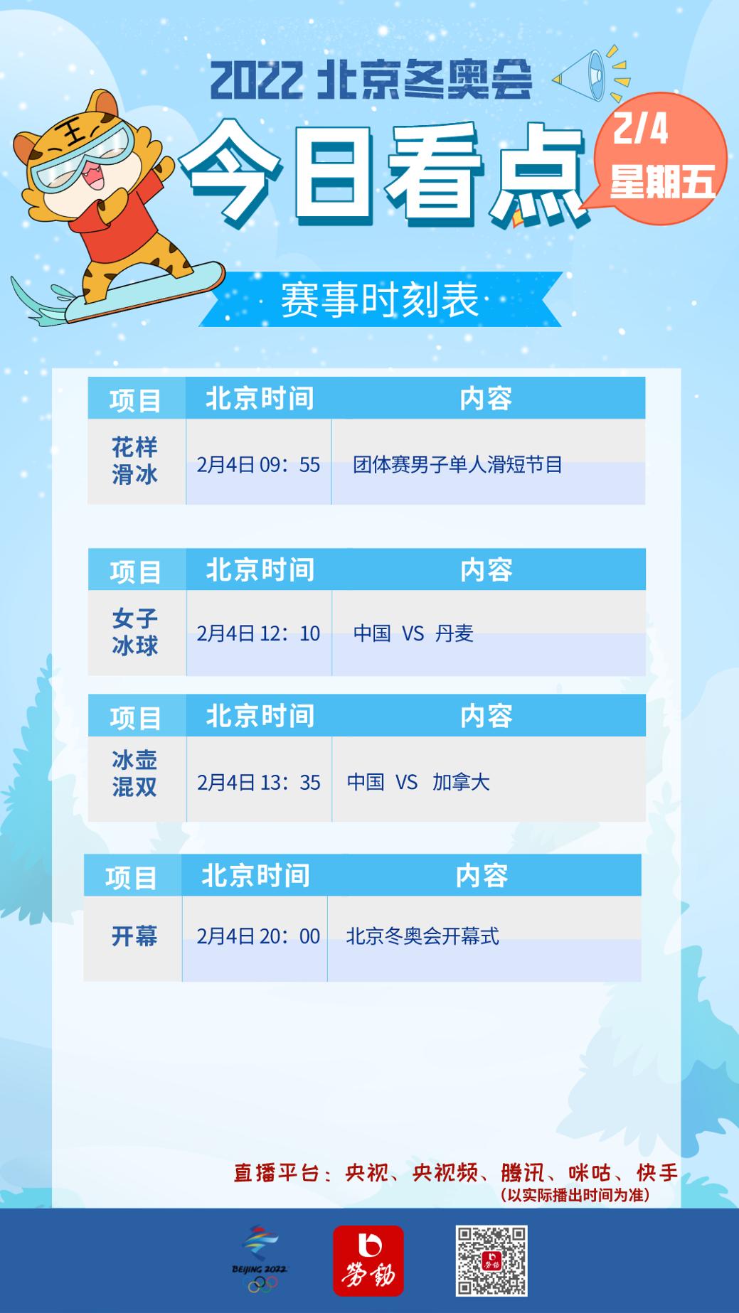 当然,2月4日最受瞩目的还属当晚20时在国家体育馆鸟巢举行的北京冬奥会开幕式。经过数年精心筹备,中国将向世界奉上一台什么样的视觉盛宴?当中华文化与冰雪相遇,会演绎出怎样的精彩故事?2008年北京奥运会上,李宁飞天点燃主火炬的一幕还历历在目,今晚又会是谁、以什么样的方式,让冬奥圣火在“鸟巢”点燃?一起拭目以待!