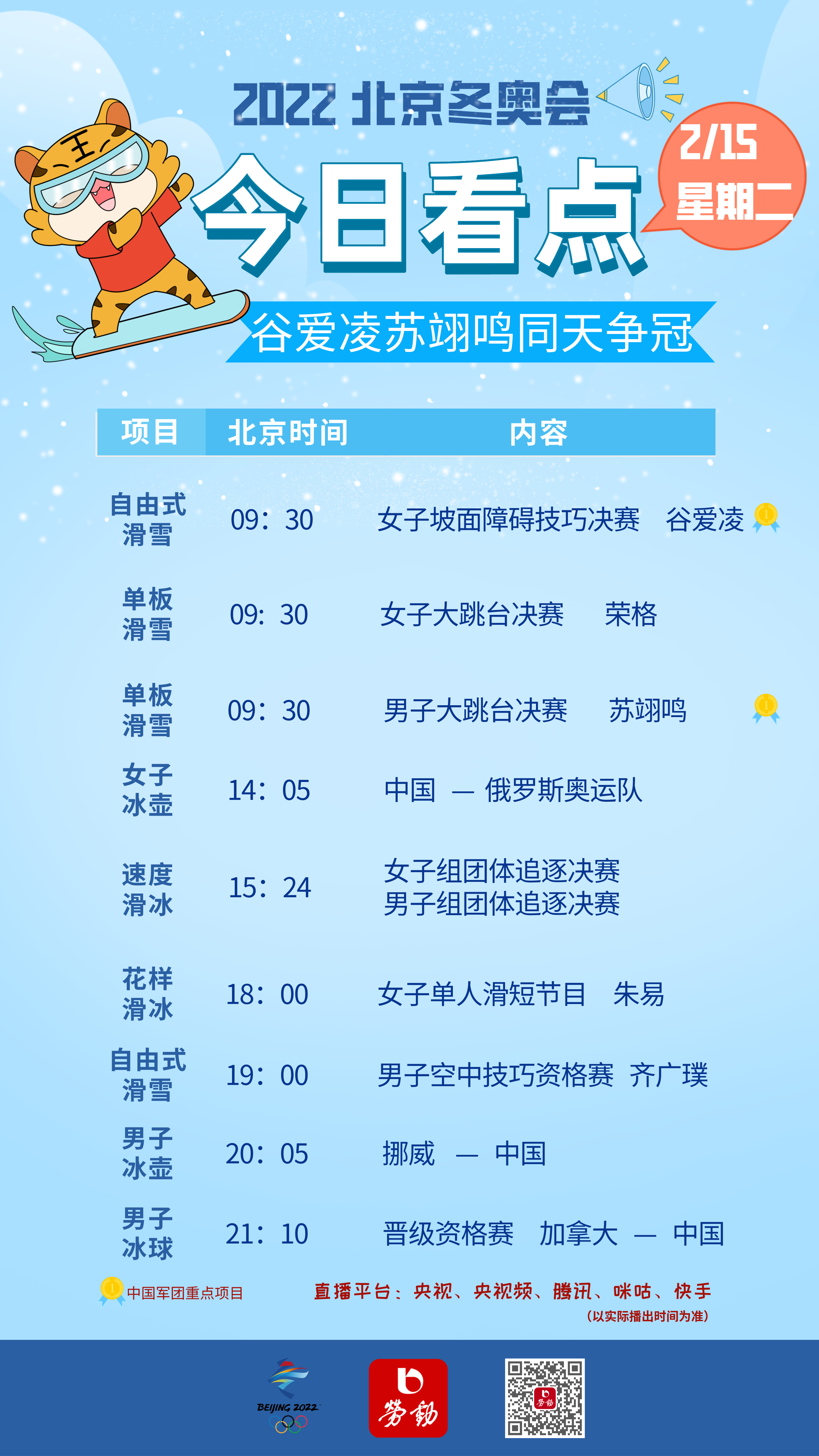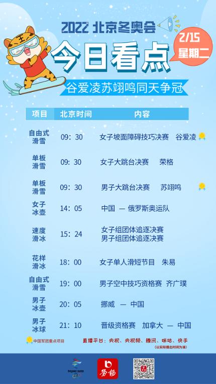 随着北京冬奥会进入下半程,中国军团的雪上项目开始发力。2月15日正逢元宵佳节,中国队将在自由式滑雪女子坡面障碍技巧、单板滑雪男子大跳台和自由式滑雪男子空中技巧中向金牌发起冲击,“冠军发小”谷爱凌和苏翊鸣也都有机会站上最高领奖台。