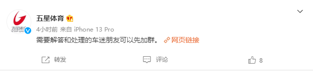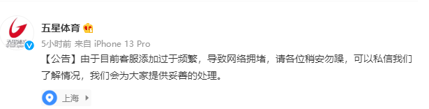 在沙特站排位赛期间,不断有车迷添加五星体育的客服微信号,想要购买年度会员。以至于五星体育通过官方微博发了两条信息,一是提醒大家观赛的话可以先入群,二是客服添加过于频繁,导致网络拥堵。