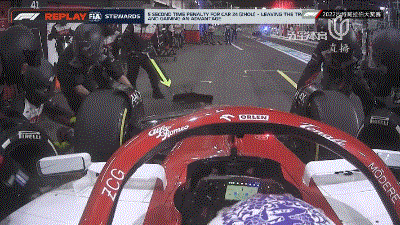 按照F1赛规,车手驾车进站接受罚时期间不得有任何外部干扰,其车队工作人员也不能碰车,但周冠宇进站一停时,车队出现了第二次失误,工作人员却立即使用千斤顶抬起赛车,准备像通常进站那样为赛车换胎。这一违规操作导致赛会再次发出对周冠宇的处罚,要求他再次通过维修区补罚5秒。