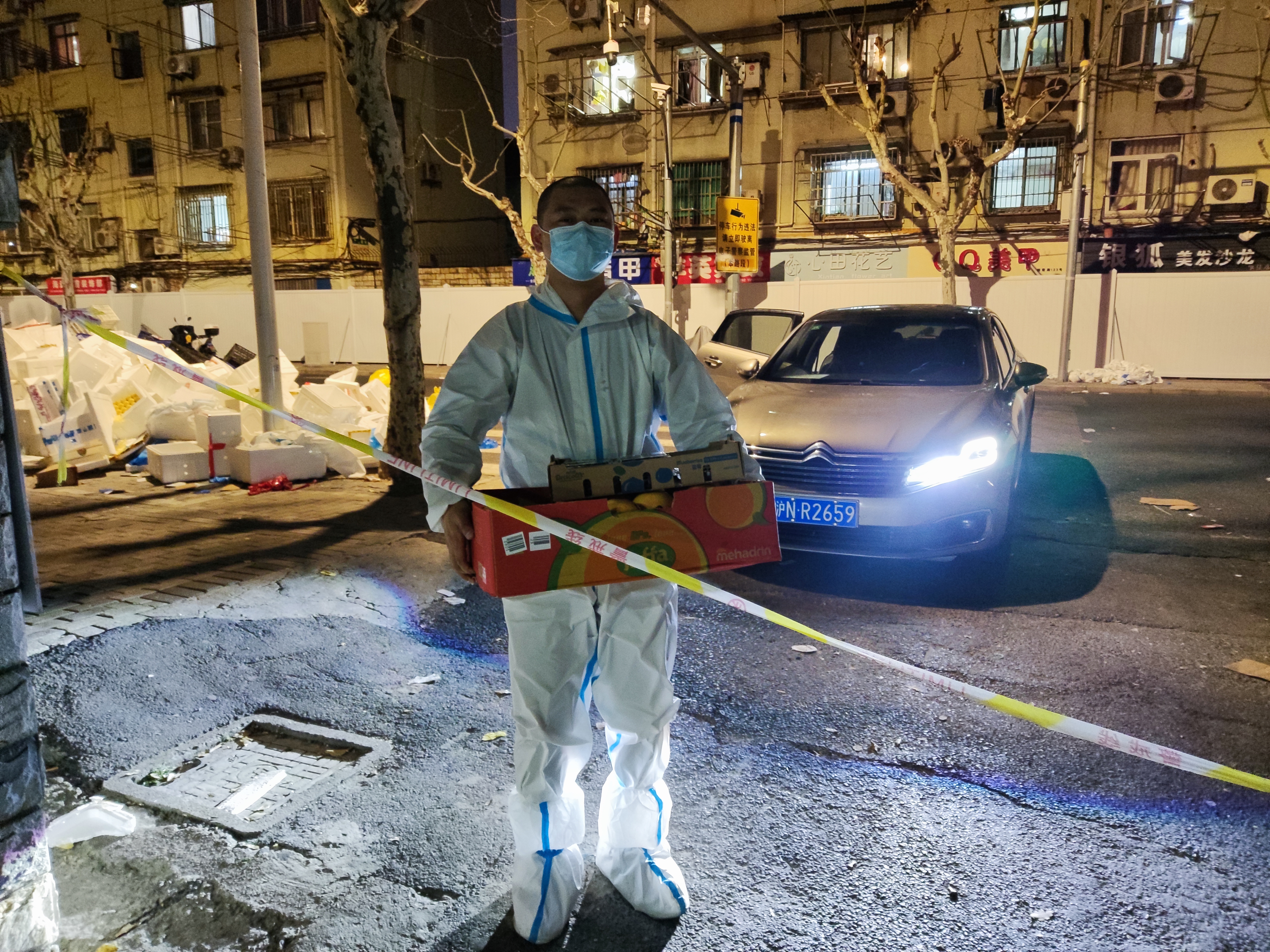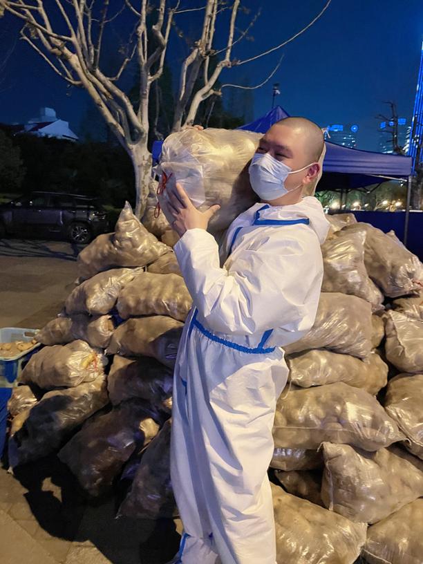 原本以艺术点亮社区的几名志愿者,就地转岗,变换身份,改以送菜暖人心。他们短时间内组建起一支服务小队,为附近居民送菜,从一天处理70包到一天2000包、10000包,再到现在每天100多吨……