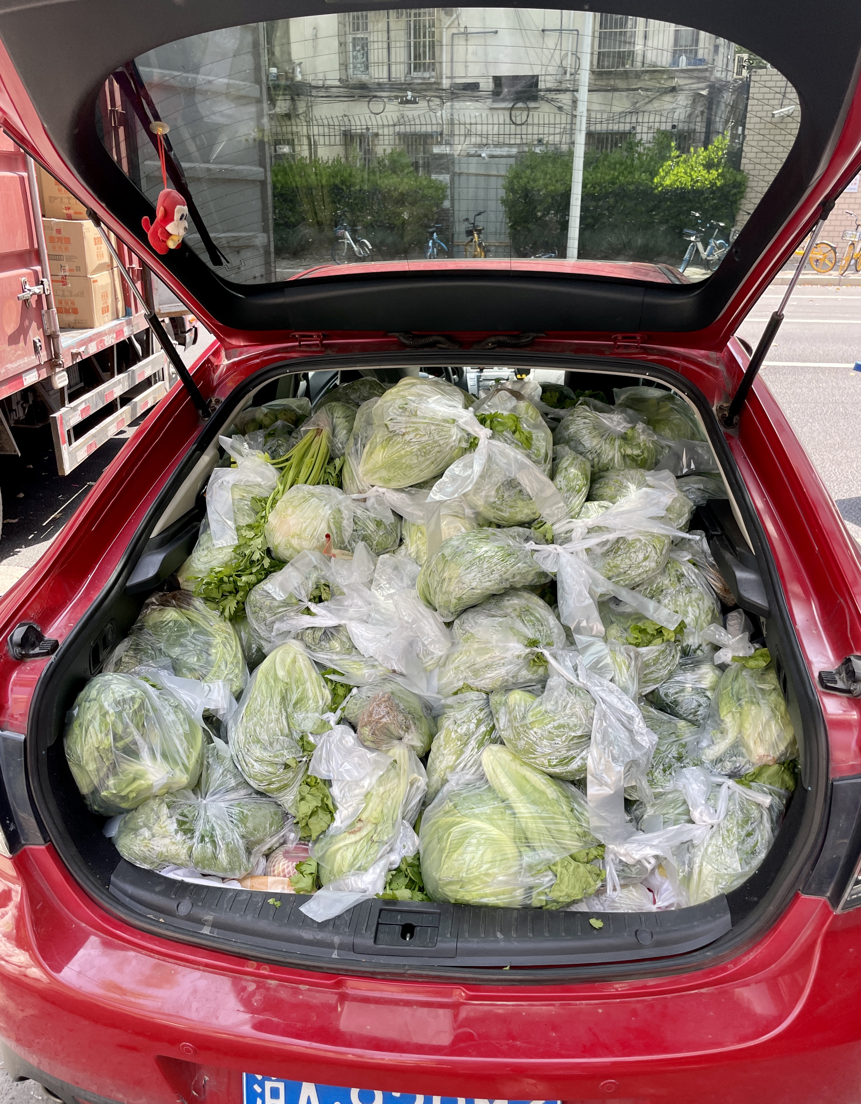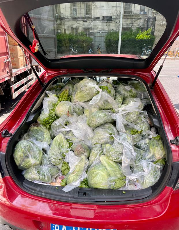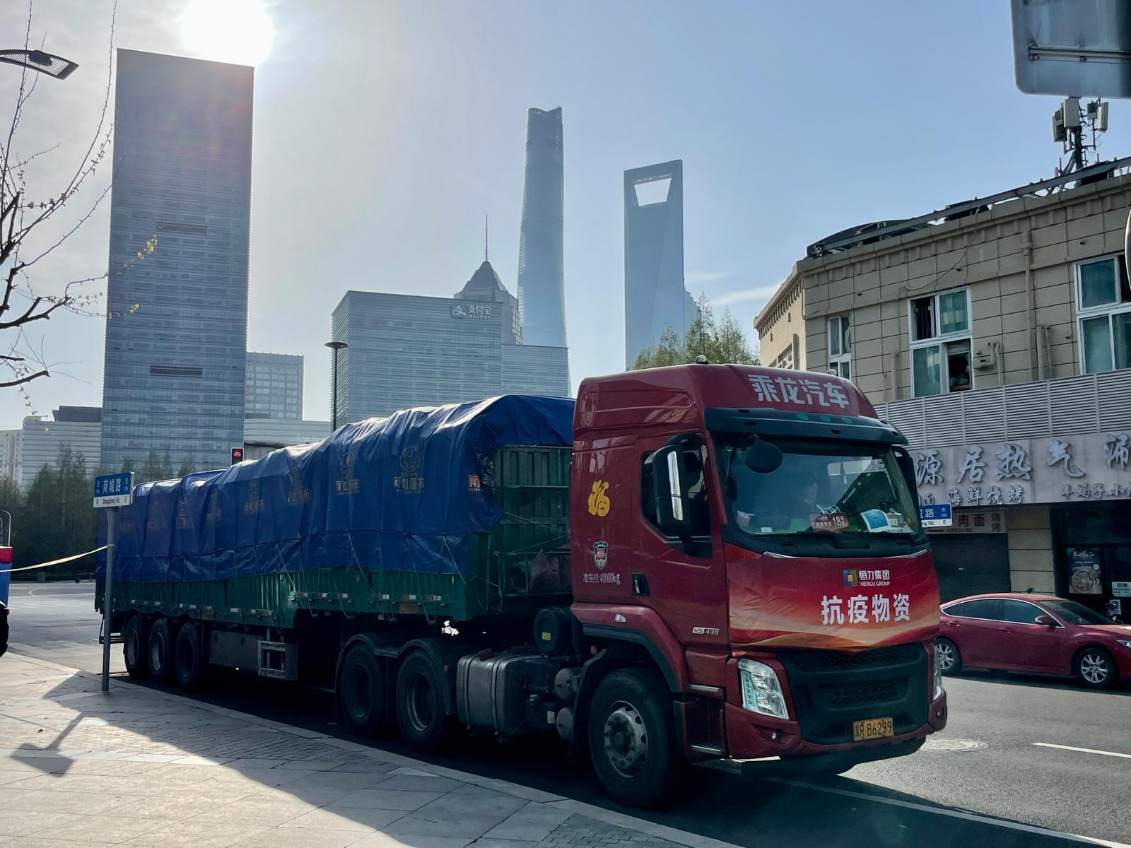 随着物资越来越多,车队也不断扩容,目前已经有四辆10吨货车、一辆32吨卡车,还有若干辆私家车。“一开始就堆在慈善超市门口,现在街面上也是菜,商城路崂山路拐角处停满了车。”张佳华说,为了避免与更多人接触,发生感染风险,也为了保障物质安全,部分志愿者晚上就睡在蔬菜车里,“远处就是小陆家嘴,真的是伴着‘三件套’入眠。”