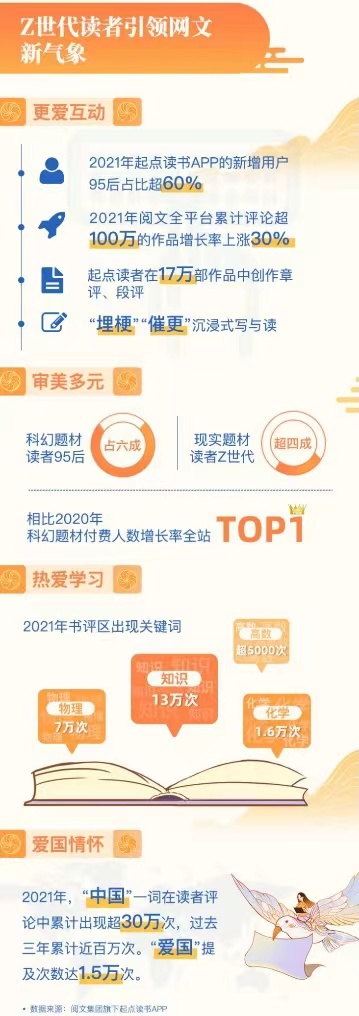 报告提出,网络文学以独特魅力,持续深入推进全民阅读的发展,并不断吸引Z世代作家读者涌入,为全民阅读注入活力和新生力量。据阅文集团数据,2021年阅文新增作家95后占比超80%,起点中文网2021年的新增用户中95后占比超60%。