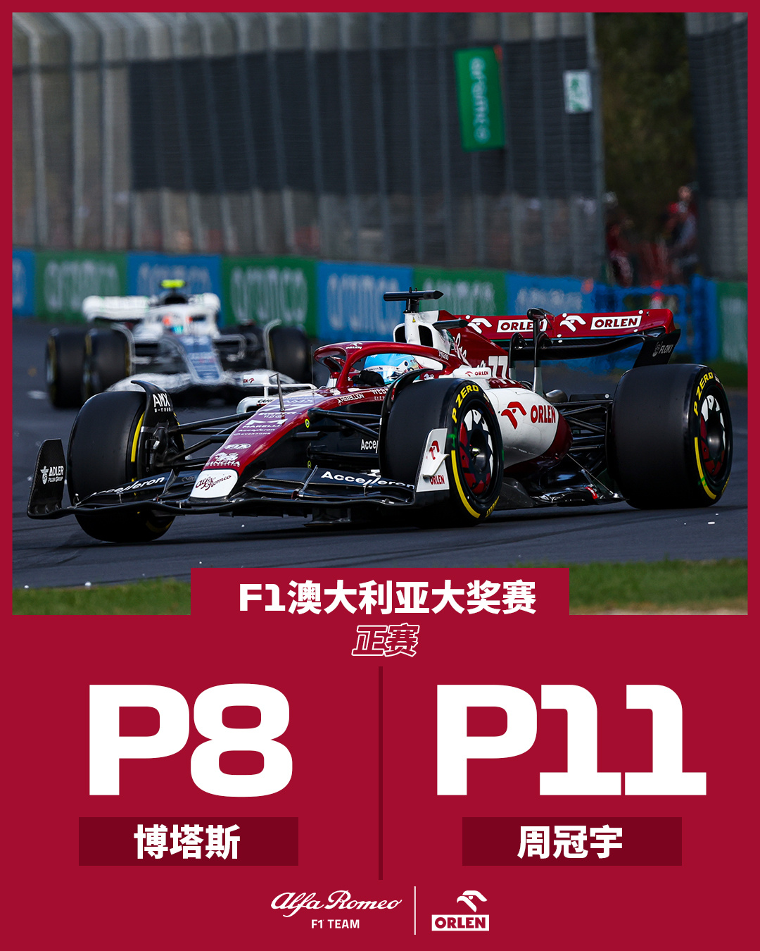 在澳大利亚大奖赛中,周冠宇的发挥依旧稳定——他连续第三站排位赛晋级Q2阶段,最终获得第14位的发车排名。起步阶段,周冠宇稳字当头,没有出现前两站的发车故障,以15位开启本次大赛。最后5圈时,周冠宇的不懈努力得到回报,他在一号弯超越儿时偶像,世界冠军阿隆索,一度逼近积分区。