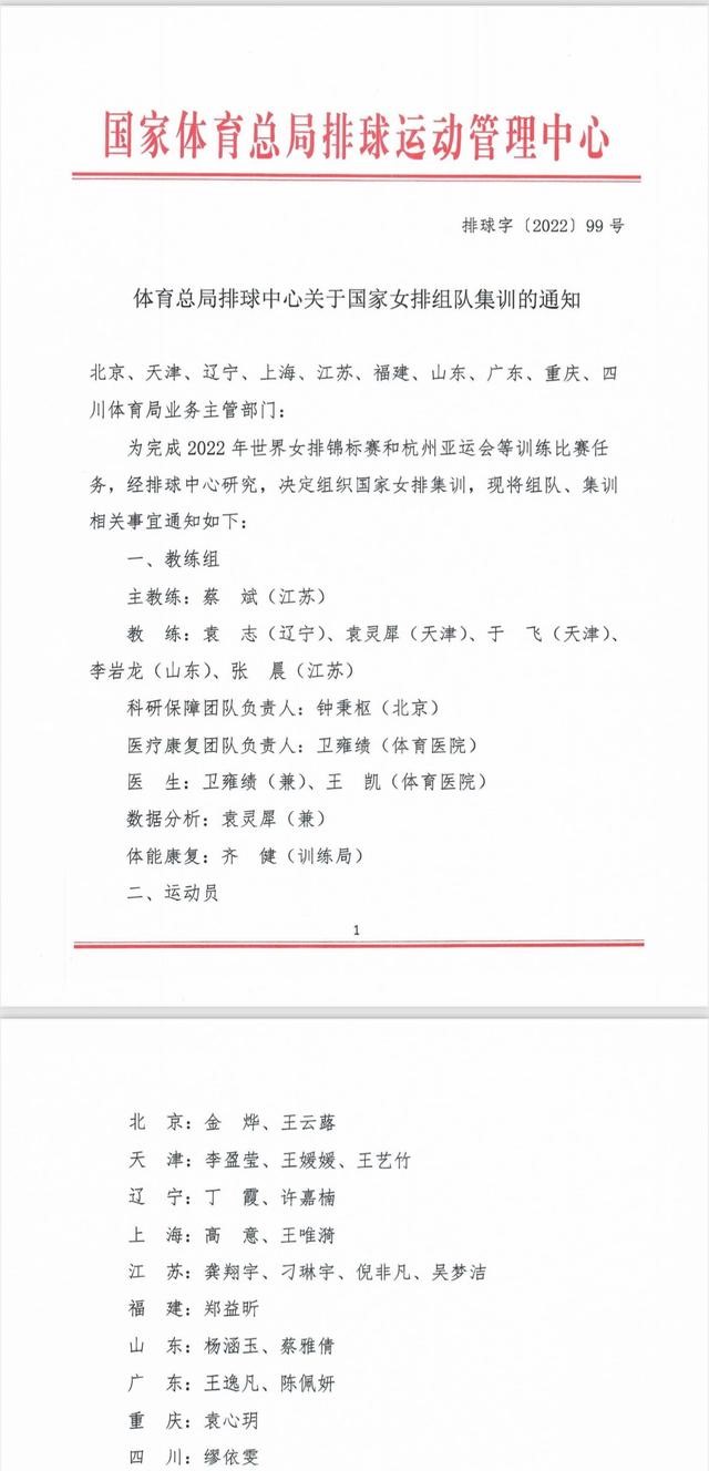 为了备战2022年女排世锦赛和杭州亚运会,4月14日下午,国家体育总局排球运动管理中心在中国排协官网发布《关于国家女排组队集训的通知》,共有20名运动员入选大名单。