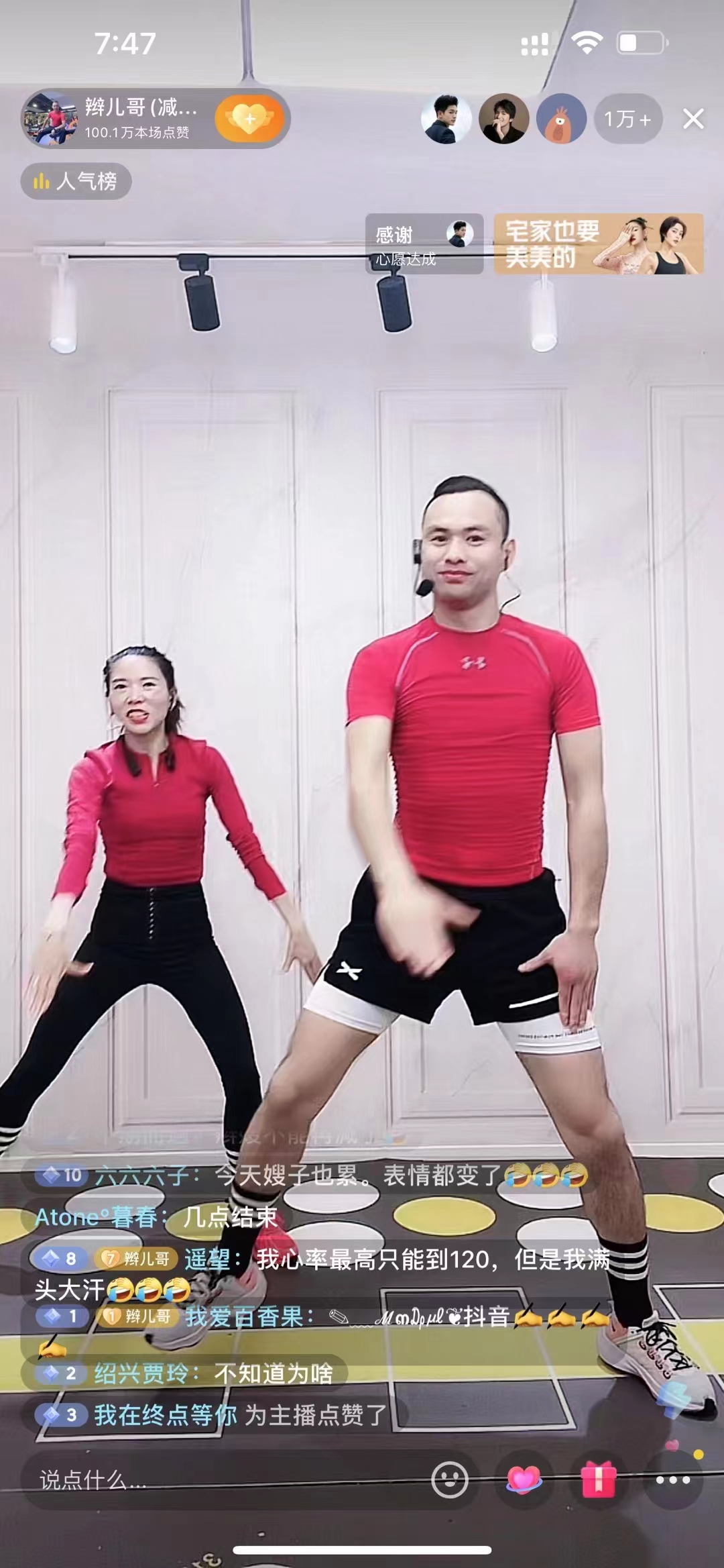 这样的模式甚至引来了模仿者,在刘畊宏没有直播的4月22日晚上,辫儿哥同样也以夫妻档和简单健身操的形式呈现,也收获了100万的点赞。