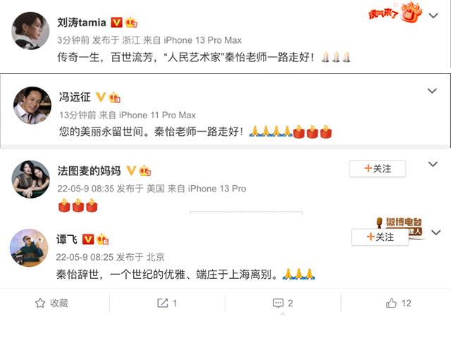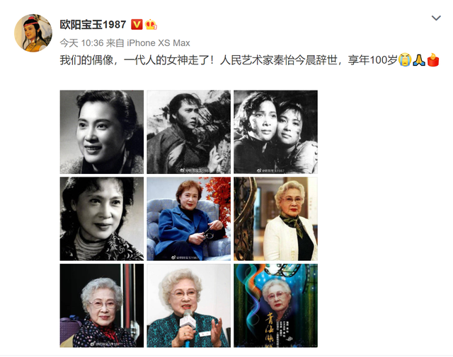 演员欧阳奋强也转发了多张秦怡的照片,表示“我们的偶像走了。”