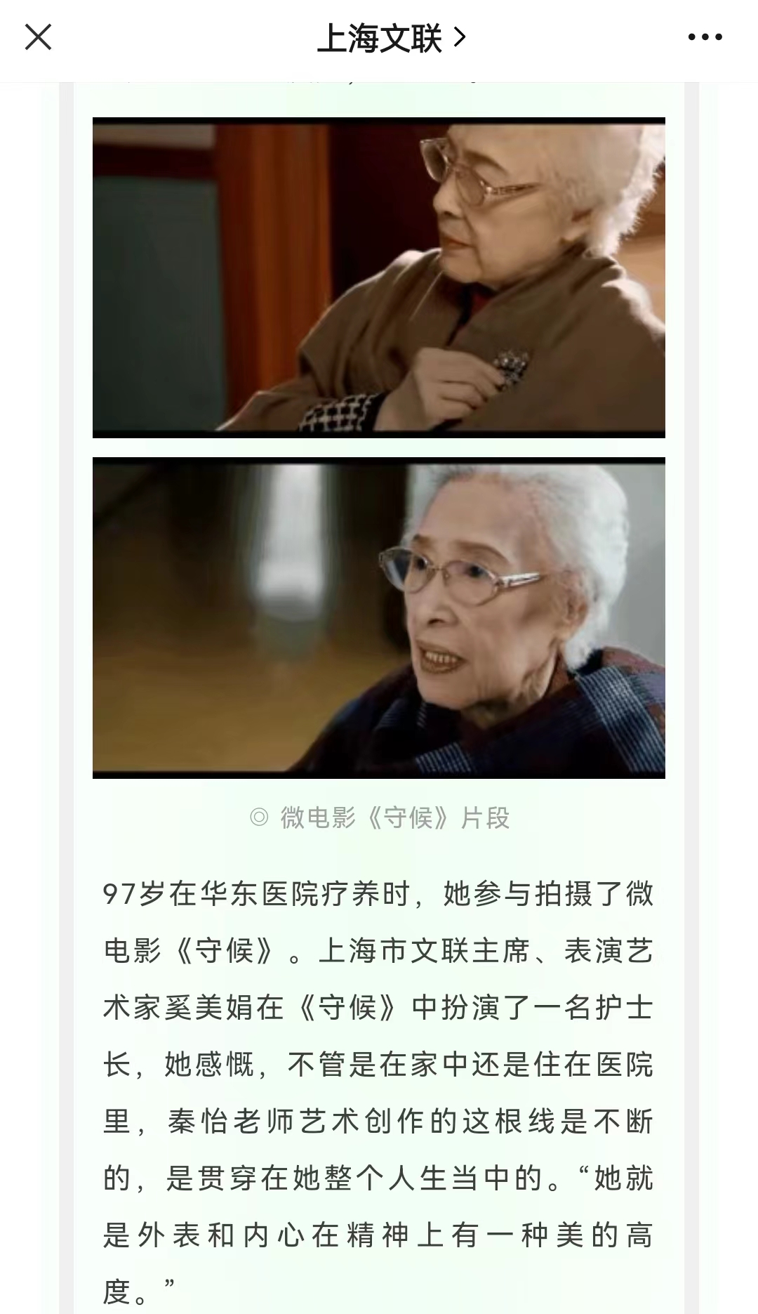 随后上海文联也发文悼念,文中回忆了97岁的秦怡在华东医院疗养时,参与拍摄微电影《守候》的情景。当时,上海市文联主席、表演艺术家奚美娟在《守候》中扮演了一名护士长,她感慨,不管是在家中还是住在医院里,秦怡老师艺术创作的这根线是不断的,是贯穿在她整个人生当中的。