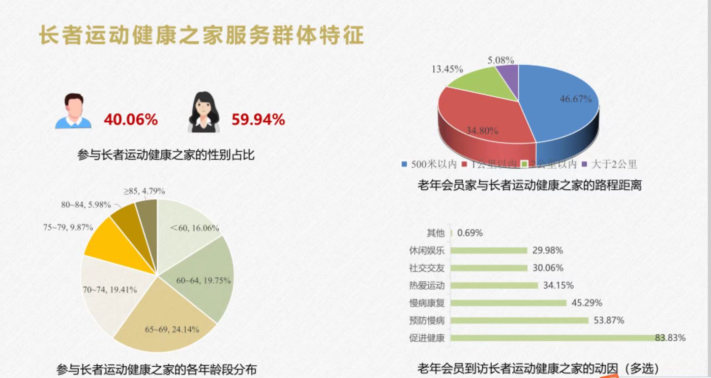 根据今年3月上海体育学院开展的《上海市长者运动健康之家发展报告》研究数据,长者运动健康之家服务的长者人群中,男性占比40.06%,女性占比59.94%;以60-74岁年龄段为主,占比63.3%,基本覆盖各年龄段的长者。长者前来锻炼的频率多数保持在一周三次以上,每次时长以60-120分钟为主。