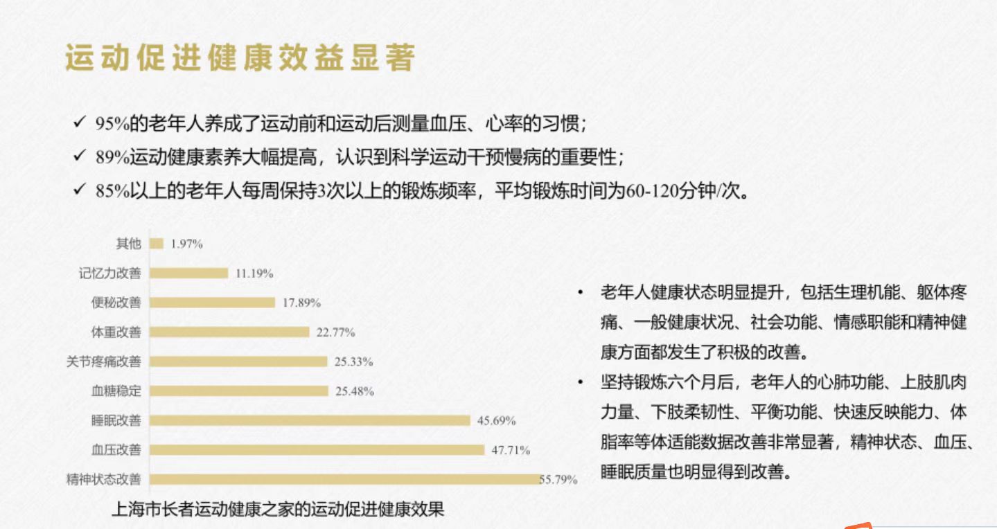 调研显示,在长者运动健康之家锻炼的长者运动效果显著:95%的长者养成了运动前和运动后量测血压、心率的习惯;89%运动健康素养大幅提高,认识到科学运动干预慢性病的重要性。